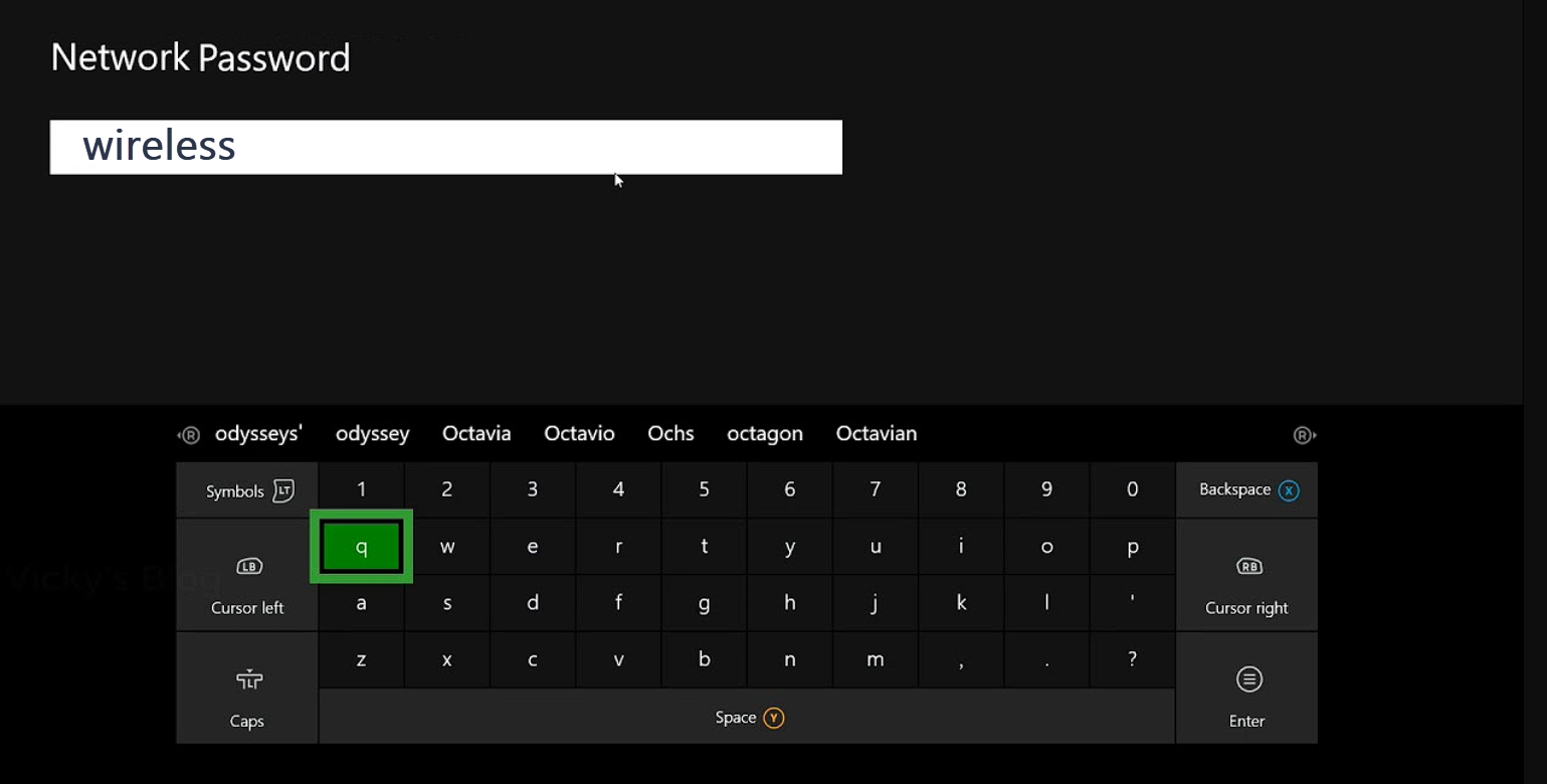 Now, your Xbox is asking for a password. This is like a secret code to get into your Wi-Fi. Please type wireless.