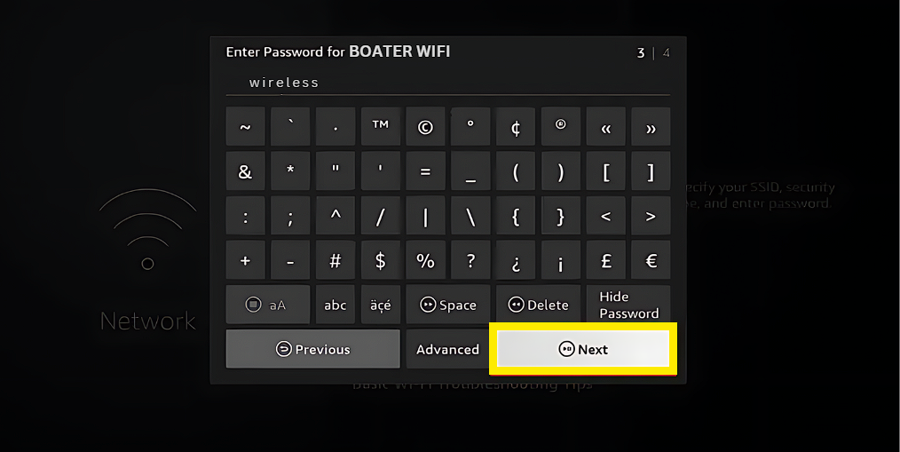 Use the remote to navigate the on-screen keyboard and type in wireless. Once done, select Next and Connect.